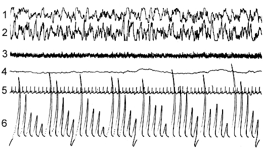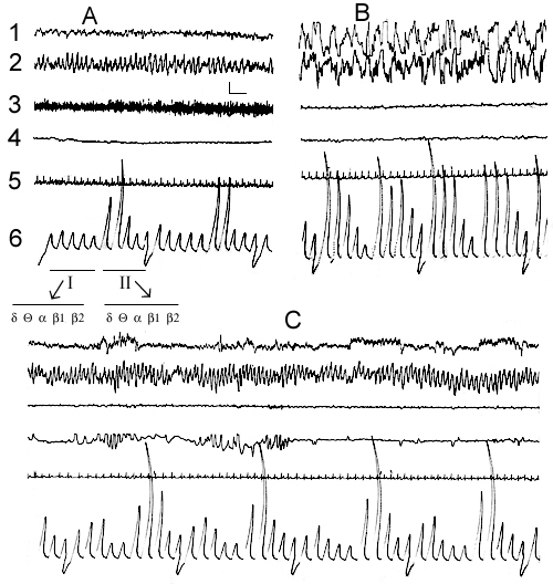 Leads: 1, sensorimotor area of the neocortex; 2, dorsal hippocampus; 3, cervical muscle; 4, oculomotor muscle; 5, cardiac rhythm; 6, the integrated values of d, Q, a, b1 and b2 rhythms from the sensorimotor area of the neocortex (first five deviations I) and dorsal hippocampus (subseqent five deviations II); Duration of integration epoch-5sec;