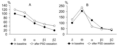 Apart from the postdeprivation increase in the total amount of SWS and PS, they enchance also in the intensity. Fig. 11A displays the comparison of pronounceness of delta, theta, alpha, b1 and b2 rhythms (or rather EEG constituents) observed in baseline SWC and in SWS following PSD by the water tank method. As is seen, all rhythms in a sensorimotor area of the neocortex in the postdeprivation SWC exceed in the amplitude the respective rhythms in baseline records. In addition to augmentation of the slow EEG constituents, attention attracts a reliable increase of comparatively high-frequency beta rhythms (especially b2), indicating relatively high activity of the brain, irrespective of deepening at this time of the so-called "delta sleep".