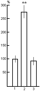 Figure 12. Influence of PSD by the instantenous awakening method on the frequency of PS onset. Columns: 1-in baseline (is taken to be 100%); 2-in the time course of deprivation procedure, 3-in the postdeprivation period after PS rebound ending, when PS amount returns to baseline level.
