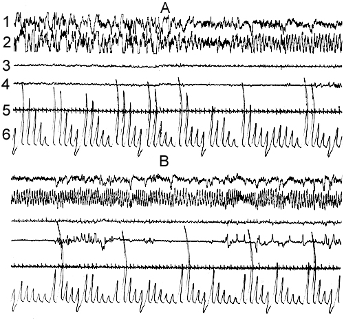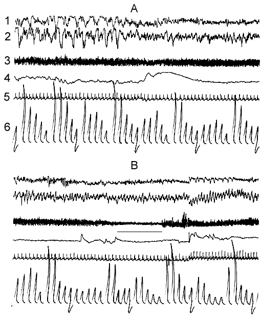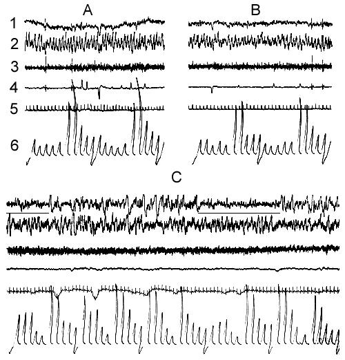 The transition from passive wakefulness to slow-wave sleep (SWS), i.e. falling asleep in a comfortable experimental chamber takes place rather fast, but still gradually. At the beginning develops light SWS (LSWS), which is soon replaced by deep SWS (DSWS). Such transitions, under these conditions, are usually accomplished at the posture optimal for sleep. Very often the cat lies with the body stretched still at wakefulness and, respectively, occurs relaxation of the body. Very often passive wakefulness actually proceeds also in a sitting posture, but even in this case before the onset of LSWS the cat lies down and curls up. Naturally, the body gets more relaxed during DSWS (Fig. 1B) when tonic activity of the cervical muscles disappears altogether. At this moment electrical activity of both the neocortex and hippocampus shows the prevalence of waves of delta-, theta- and alpha range, while the beta rhythms appear less pronounced. During DSWS there is lack of considerable eye movements, the more so of rapid movements. Heart rate during DSWS is noticeably low as compared to wakefulness and what is more characteristic, it is even.