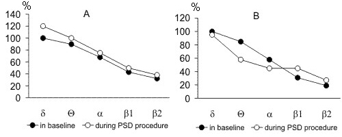 Figure 11. The pronounceness in the amplitudes of d, Q, a, b1 and b2 rhythms in the recording of baseline SWC and recordings of postdeprivation period after cessation of PSD procedure by water tank method. A, during SWS in the sensorimotor area of the neocortex; B, during PS in hippocampus. (the amplitude of baseline d rhythm is taken to be 100%).