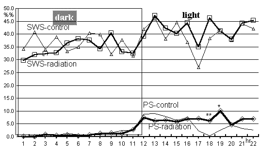 During 1 hr exposure 4 animals (preliminary implanted under local procain anesthesia with conventional electrodes for cortical, hippocampal and olfactorial EEG, and neck EMG recordings) were placed simultaneously into individual narrow wooden boxes with their heads directed to the side of parabolic antenna of electromagnetic wave radiator at the distance of 1 m from it. Otherwise the same animals exposed in front of the switched off radiator were used as controls. Exposition took place between 8:00-9:00 PM. Then the animals were transferred to their habitual individual chambers and a 22-hr continuous paperless polygraphic recording was started at 9:30 PM simultaneously with the beginning of 12 hr dark period. After the experiments had been completed, the recordings were scored visually, and hourly percentages of wakefulness (W), slow wave sleep (SWS) and paradoxical sleep (PS) for both experimental and control conditions were averaged, compared and analyzed statistically using Mann-Whitney U-test.