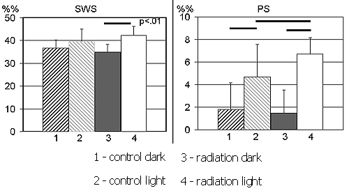 The most important effect was a pronounced increase in PS delayed for as much as 16 hr from the end of the exposition. The tendency to increase in PS percentage which was clearly seen within 17-19th and 21-22nd hrs, reached significance level at the 18th and 19th hrs (Fig. 1). Generally, despite a weak tendency to decrease in PS at the beginning of the light period (12th-16th hrs), its total duration for the entire 10-hr period (Fig. 2) was significantly higher (increment more than 40%, p<0.05) as compared to the control value (100%).