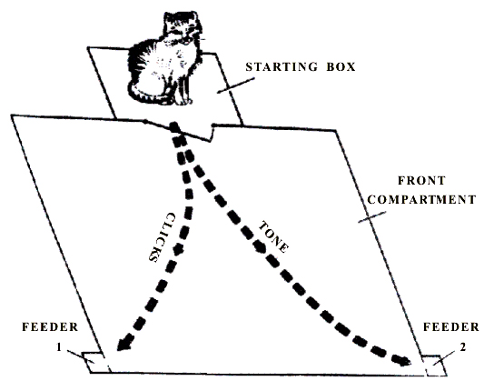 Procedure of elaboration of instrumental alimentary reflexes. Elaboration of instrumental alimentary reflexes was effected in a special experimental chamber (Fig. 1) consisting of two compartments. The rear part of the chamber with the area of 0.3 m2 served as the starting place where the animals were kept in the intertrial period. In the front compartment with the area of 1 m2 outside at the front side-walls feeders were placed from which the animal received food reinforcement by raising the suspended door. Before starting the elaboration of instrumental food-motor conditioned reflexes to two feeders, the animals had been, for several days, adapted to the experimental chamber. Within this time they learned to open the suspended door with the forepaws and procure a piece of meat from the feeders fastened outside to the front edge of the chamber side-walls. Thereafter conditioned food-motor reflexes to sound discrimination were elaborated namely to the two feeders. Tone of 500 Hz served as a conditioned signal for one feeder, and clicks for the other. In response to the former, the animal was expected to go to the right, in response to the latter, to the left. The source of sound was placed on the top of the front wall at the very ceiling of experimental chamber. 5 sec after the onset of one or the other signal the door of the starting section was opened and the cat was allowed to perform the food-procuring behavior.