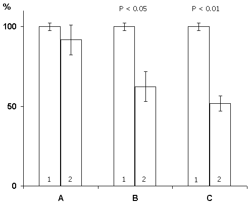 White columns in each pair - control group of animals; gray - experimental ones.