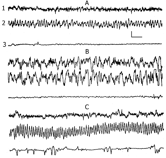 Recordings: 1 - sensorimotor area of the neocortex, 2 - dorsal hippocampus, 3 - electrooculogram. A - wakefulness, B - slow wave sleep, C - paradoxical sleep. Calibration 200 mV, time 1 sec.