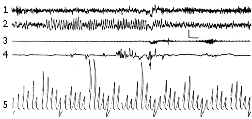 Recordings: 1 - sensorimotor cortex, 2 - dorsal hippocampus, 3 - electromyogram (cervical muscle), 4 - electrooculogram, 5 - integrated values of d, q, a, b1, b2 rhythms within the sensorimotor cortex (the first five deviations) for the 5 sec epoch. The moment of awakening is indicated by an arrow. Calibration of intensity 200 mV, time 1 sec.