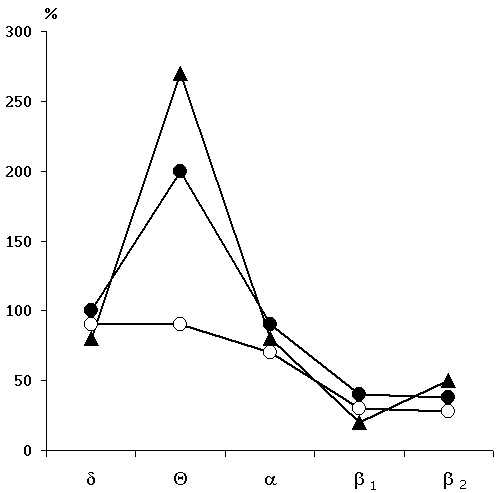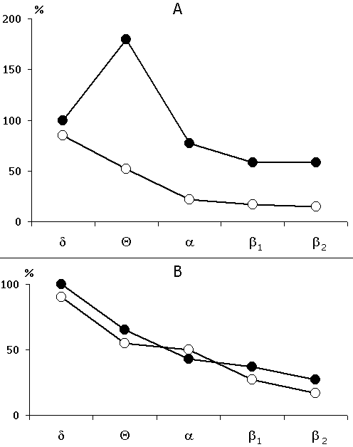Legends: black circles reflect the rhythm before the elicitation of epileptiform discharges, while the light ones - following the discharges.