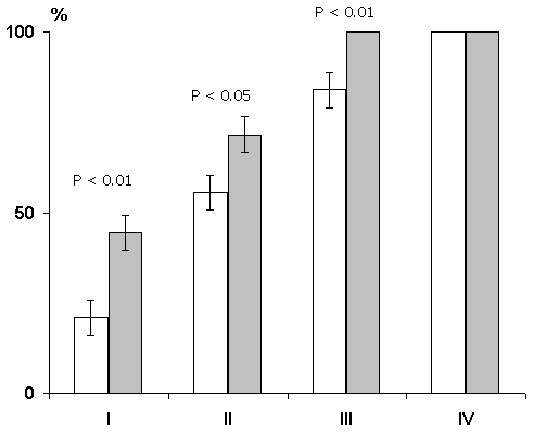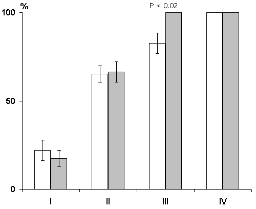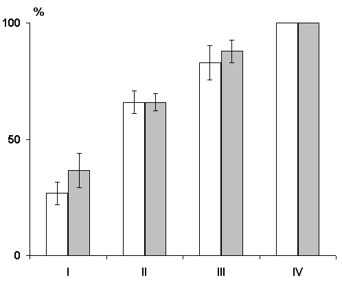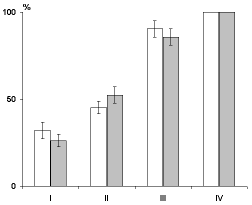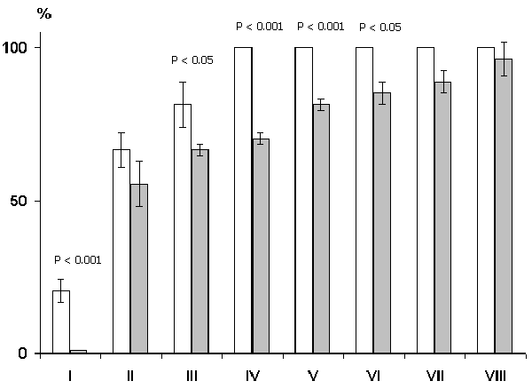 On the ordinate axis - percentage of correct responses; abscissa - learning sessions. White columns in each pair - control group of animals; gray columns - experimental ones.