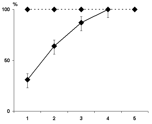 On the ordinate axis - percentage of correct responses; abscissa - learning sessions.