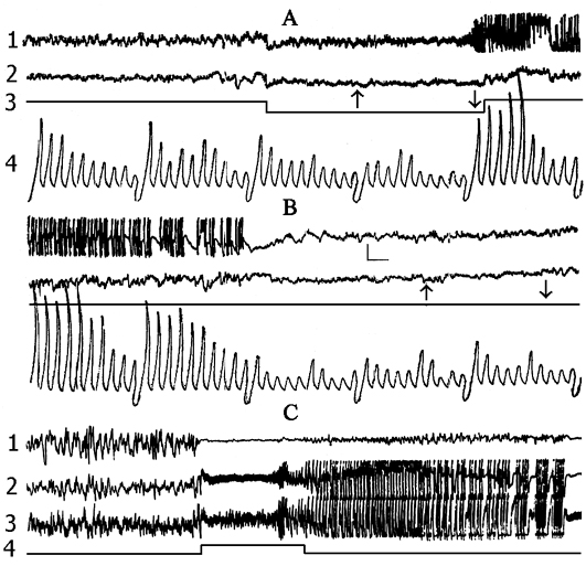 Recordings in C: 1 - sensorimotor cortex, 2 - contralateral ventral hippocampus, 3 - contralateral dorsal hippocampus, 4 - marking of electrical stimulation (5.5 V, 200 per sec., 0.1 msec). Stimulation switching is designated by upward rising line.