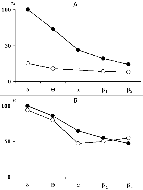 Legends: black circles reflect data before the elicitation of epileptiform discharges, while light ones - following discharges.