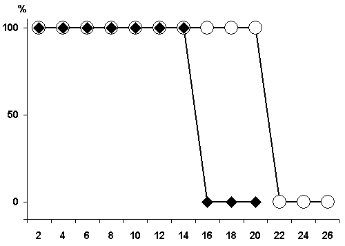 On the ordinate axis - percentage of correct responses; abscissa - number of trials. White circle - control group of animals; black rhombus - experimental group of animals.