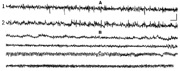 1. Changes in electrical activity of cortical areas at administration of narcotic and half-narcotic doses of E. At IP administration of narcotic dose of E (4,5g/kg) the corticogram was considerably changed. Fig.1 shows a record of the cortical areas until injection (A), 15 min. after injection (B) and 2 h later (C). As it is demonstrated, electrical activity of the cortex undergoes important changes. The amplitude was suppressed to EEG-depression. At the same time complete immobilization with muscle relaxation and spinal reflexes inhibition were observed.