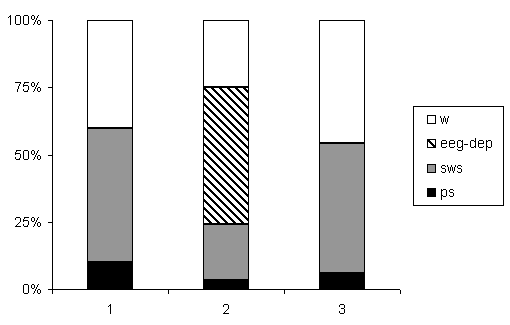 Percentage ratio of various phases in the successive SW-C after E administration is shown in Fig.2. A single injection of E (4,5 g/kg) caused significant decrease of all phases of the SW-C. Wakefulness decreased from 40% to 29%, SWS reduced from 53% to 29%, PS was suppressed from 7% to 2%. EEG-depression occupied 39% of the total experimental time. As it was mentioned above, polygraph recording of the cycle was continued on the second day of E treatment. The total duration of wakefulness was longer as compared to the background; the total length of SWS and PS consequently was suppressed.
