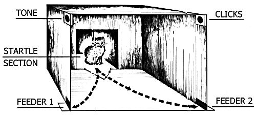 Test and procedures of learning. Animals were conditioned in the test of elaboration of instrumental spatial sound discrimination to two feeders with food reward. Learning was processed in a special experimental cabin, consisting from two part (Fig.1). Rear part of the experimental cabin, with the area of 0.3 m2 served as the starting box where the animals were kept in the inter trial period. In the front part with area 1 m2 outside at the front side-walls feeders were placed from which the animals received food reward by raising of suspended door. Tone of 500 Hz served as a conditioned signal for one feeder, and clicks - for other. In response to the former, the animal was expected to go to the right, in response to the latter, to the left. The source of sound was placed on the top of front wall at the very ceiling of experimental cabin. 5 sec after the onset of one or the other conditioned signal the door of the starting box was opened and the animal was allowed to perform the food- procuring behavior. The conditioned signals were given accidentally. As soon as the animal took the food reward the conditioned signal used to be interrupted. A ten-fold pairing of each conditioned signals with food reward were made in one of the learning session. After reaching of 100% level of correct responses for four consecutive days, learning was finished.