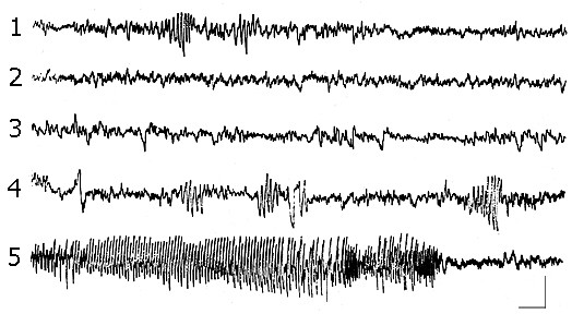 Leads: 1 - sensorimotor cortex, 2 - auditory cortex, 3 - visual cortex, 4 - amygdala, 5 - hippocampus. Parameters of electrical stimulation - 5 V, 200 Hz, 0,1 ms. Callibration - 200 mV, time - 2 sec.