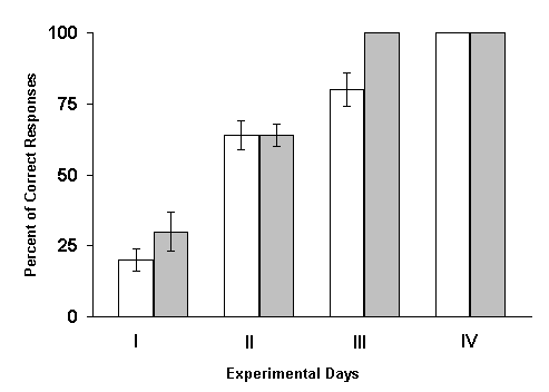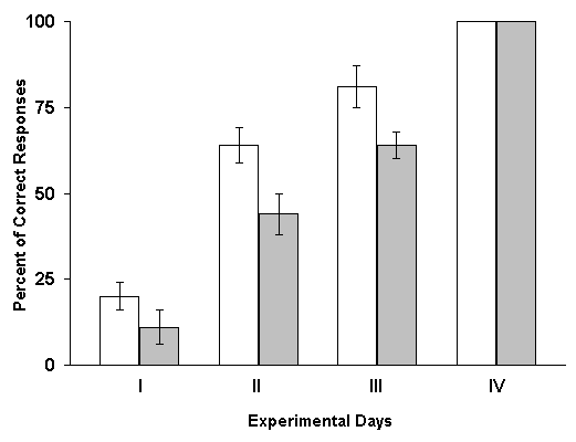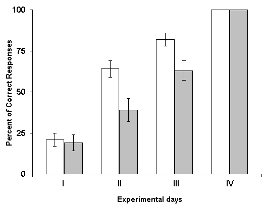 2.Influence of proactive RFI of hippocampus on the elaboration of instrumental spatial sound discrimination. A comparison of dynamics of elaboration of instrumental spatial sound discrimination within experimental and control animals has shown, that in the first three learning sessions experimental animals were significantly late by the percentage of correct responses (Fig. 4, I - p<0,05, II - p<0.01, III - p<0.02). Despite of this, a 100% level of correct responses was reached at the fourth learning session for both groups. Such a result indicates that a proactive RFI of hippocampus has a stronger effect on the elaboration of generalization of instrumental alimentary reflexes than, on subsequent discrimination of conditioned signals. Such a conclusion follows from the supposition that in the case of two choices, the level of 50% correct responses indicates, that sound stimuli acquire a signal meaning, so the choice of feeders is quite random, whereas the further increase of correct responses must reflect discrimination of conditioned signals.