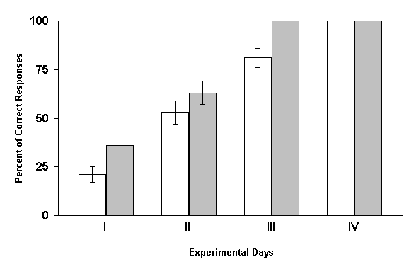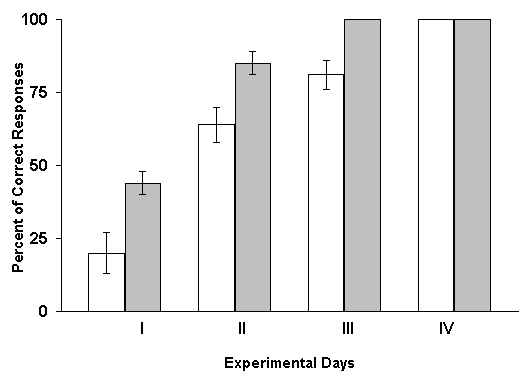 A most significant facilitation of elaboration of instrumental spatial sound discrimination was observed in the case of eliciting of RFI of hippocampus just immediately after each pairing of conditioned and unconditioned signals. The results of these experiments are presented on Fig. 8. A 100% level of correct responses was achieved on a third day in this case too, but on a first and second days of experimental work there was a more pronounced improvement of elaboration of instrumental spatial sound discrimination than in preliminary two experimental groups (Fig. 8, I - p<0.001, II - p<0.001, III - p<0.001).