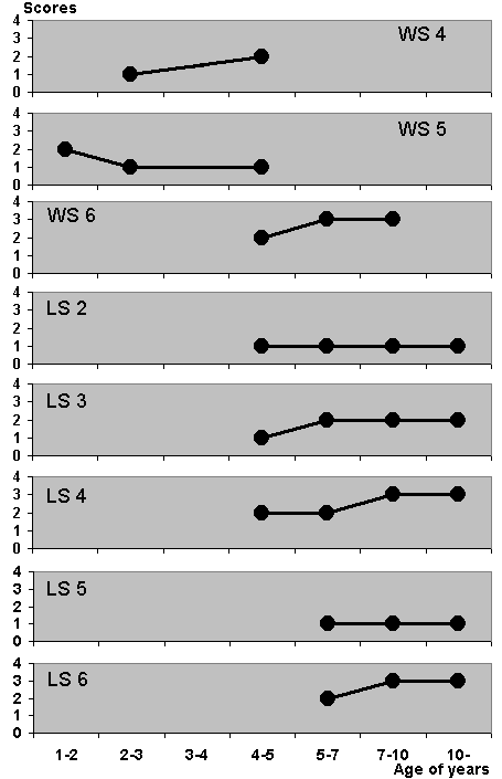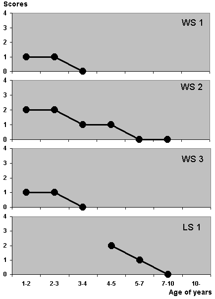 In patients WS1, WS2, and WS3, epileptic seizures were controlled within 6 months after the appearance of their initial symptoms. In LS1, it took 3 years for seizures to cease. In spite of this difference, the scores of all four patients decreased with age, and became 0, although it took 2 to 4 years after epileptic seizures disappeared.