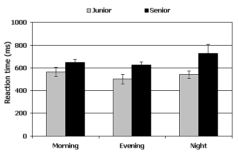 Figure 1. Mean reaction time in msec (± sem) in the Visual Discrimination Task during the morning, evening and night session in Juniors and in Seniors.
