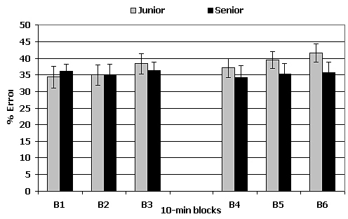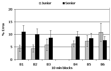 Figure 2. Time course of the mean percent error (± sem) by 10 min blocks in the Visual Discrimination Task during the night session in Juniors and in Seniors.