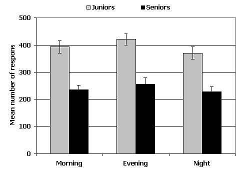 Figure 3. Mean number of response (± sem) in the Descending Subtraction Test during the morning, evening and night session in Juniors and in Seniors.