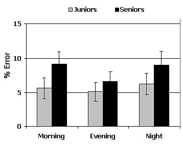 Figure 4. Mean percent errors (± sem) in the Descending Subtraction Test during the morning, evening and night session in Juniors and in Seniors.